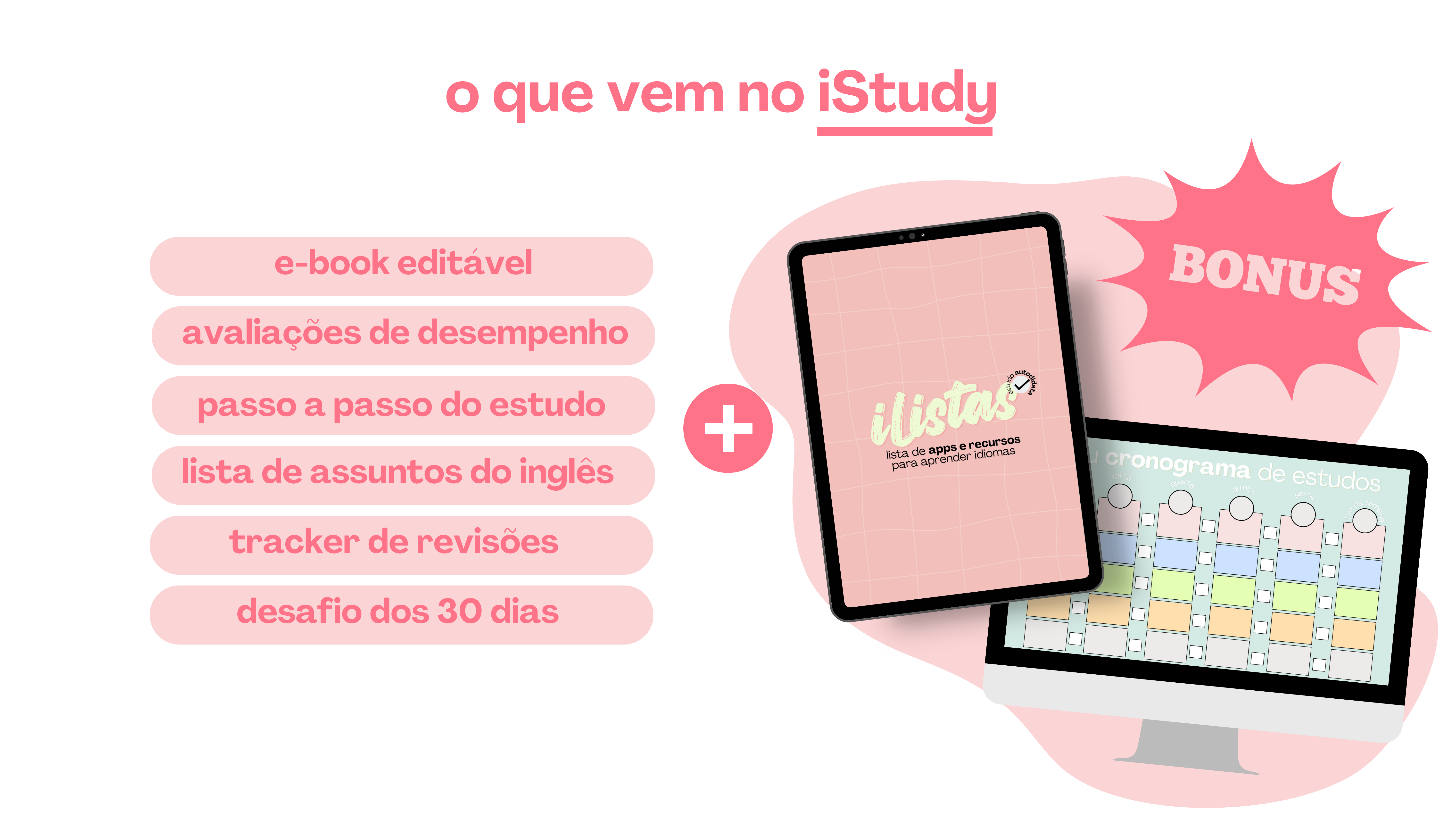 Chega de se perder nos estudos! O iStudy é um guia completo que traz método comprovado, cronogramas prontos e ferramentas de organização para você finalmente ter consistência e progresso visível no inglês.